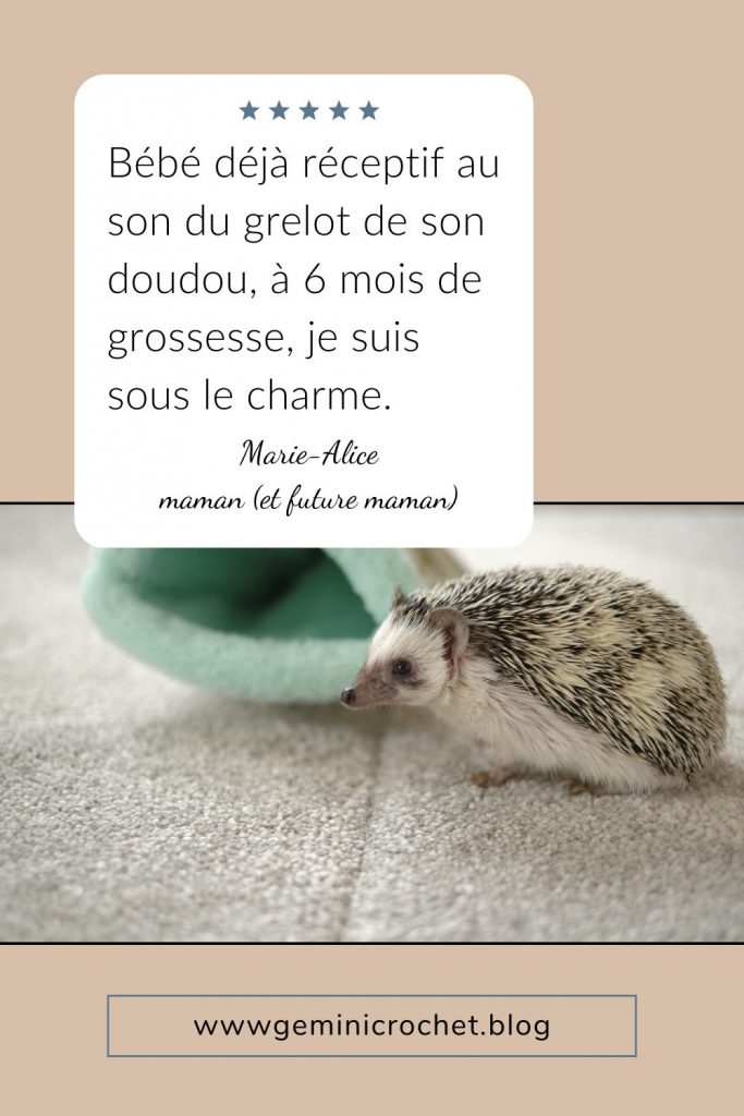 Aujourd’hui, la petite destinataire de ce beau présent crocheté a six mois, et ce doudou hérisson au crochet l’accompagne dans son quotidien. Il est devenu un objet familier, rassurant, façonné par l’amour et les détails soigneusement choisis pour elle.